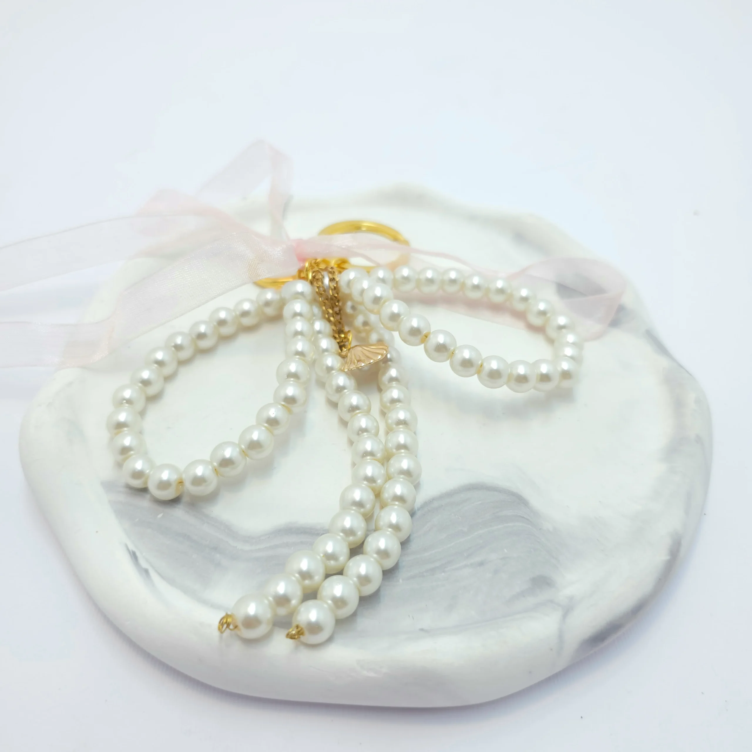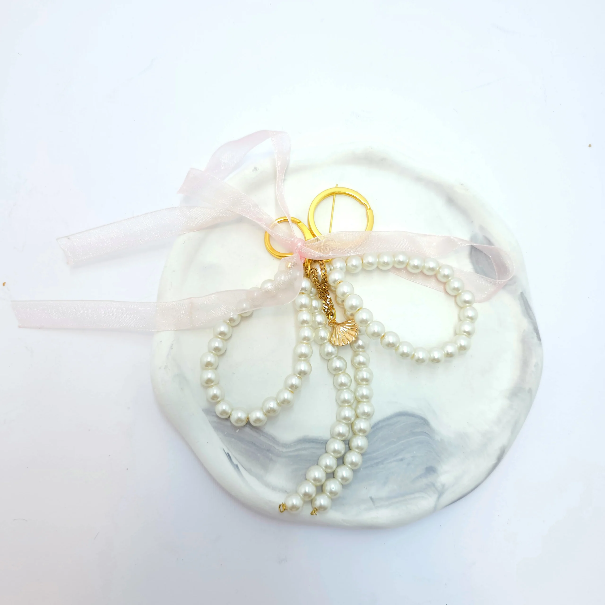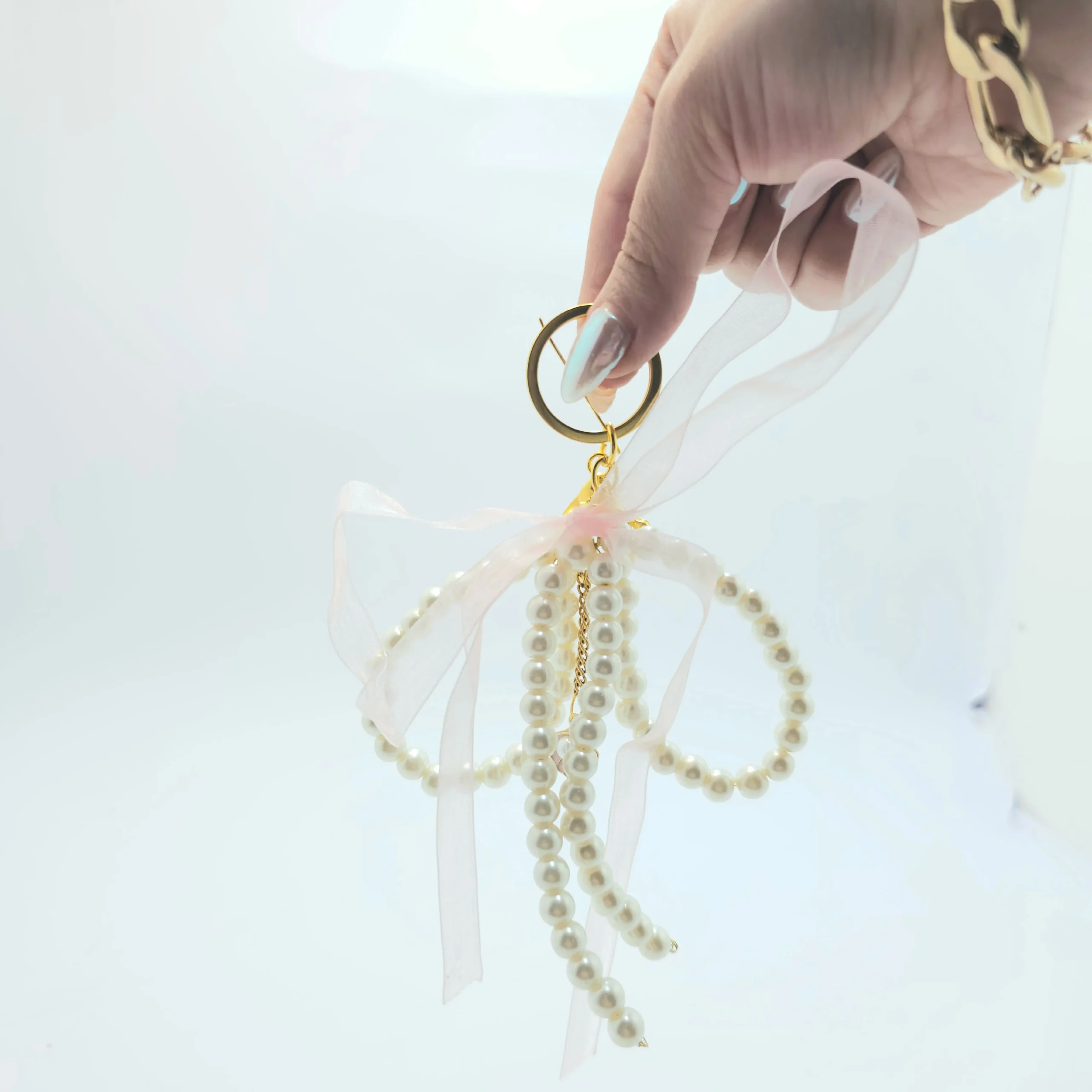 آویز کیف و جاسوییچی مرواریدی با طراحی کلاسیک و شیک، پلاک صدف طلایی و ربان صورتی ملایم.